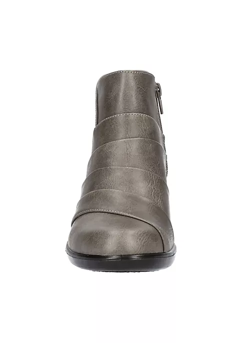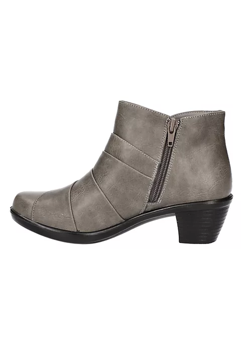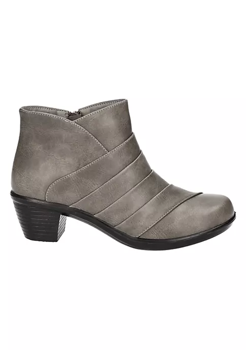 The Sonya bootie by Easy Street is all about the fashionable overlay detail upper. The Comfort Wave construction is lightweight and styled on a fashionable block heel. An easy on/off inside zipper and enhanced with the Easy Motion by Easy Street ultra-light insole for all-day comfort.